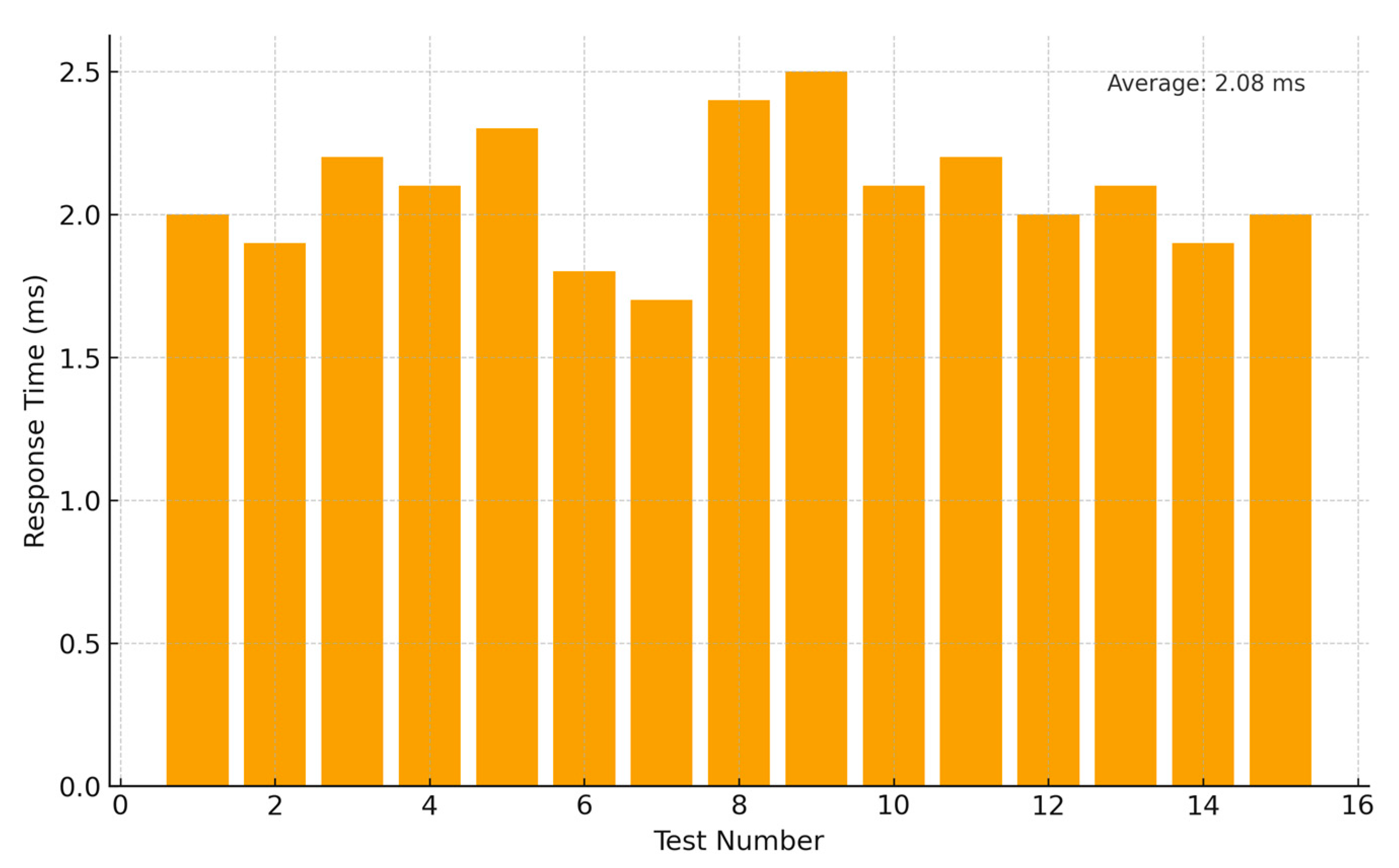 To enhance the readability of response time test data, this paper further plots the response times from 15 tests as a bar chart (see Figure 12). Compared to tabular representations, graphical displays provide a more intuitive visualization of the distribution and fluctuation range of response times.