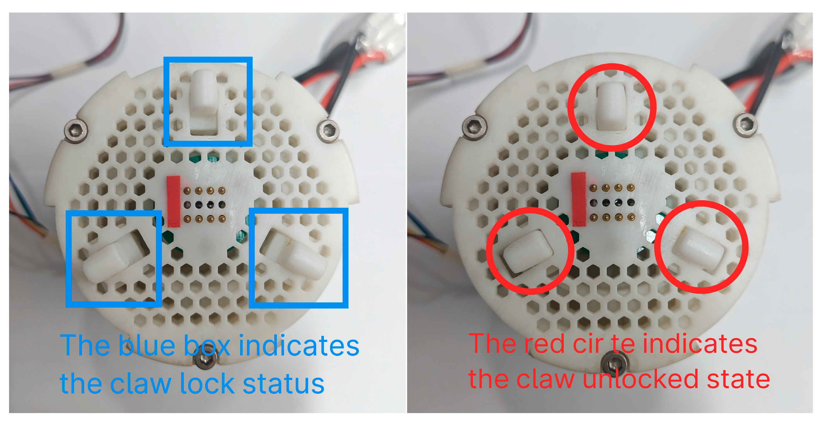Test results are shown in Figure 13. The left image shows the claw in the locked state, highlighted in blue, while the right image shows the claw in the unlocked state, circled in red. The quick-change device’s locking and unlocking functions operate normally. The chuck module’s locking torque meets the quick-change device’s locking requirements, enabling smooth disengagement from the tool end. Results confirm that the designed quick-change device’s transmission mechanism and control logic are sound, with stable system performance providing a solid foundation for subsequent integrated assembly experiments.