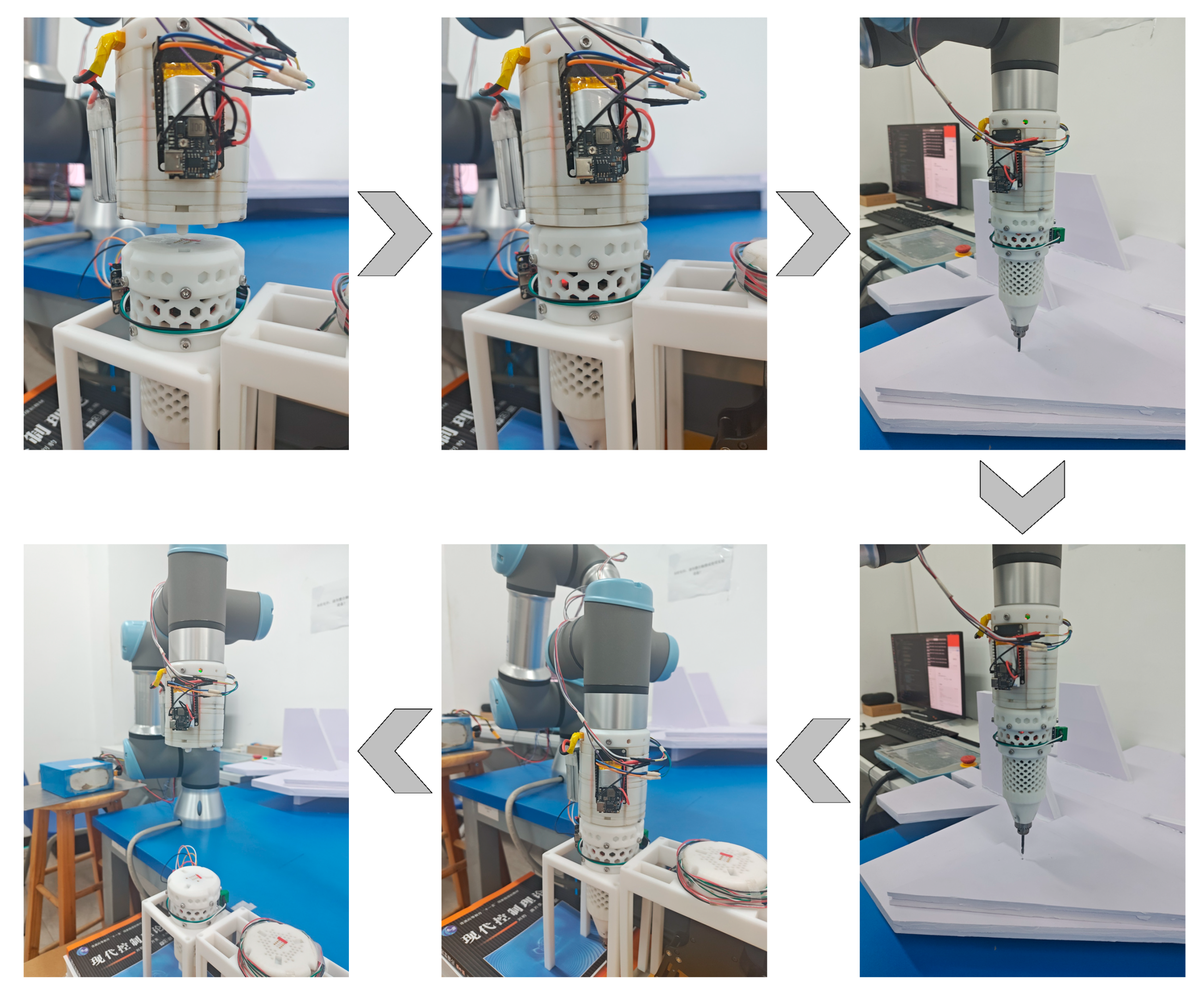 Device Design: The self-developed quick-change device shown in Figure 2 employs photopolymerization 3D printing for rapid prototyping of most white structural components. This design prioritizes rapid construction of a lab-scale functional verification platform to enable efficient iteration and validation of the quick-change control system, interface protocols, and task workflows. It does not pursue ultimate structural strength or service life under industrial conditions.