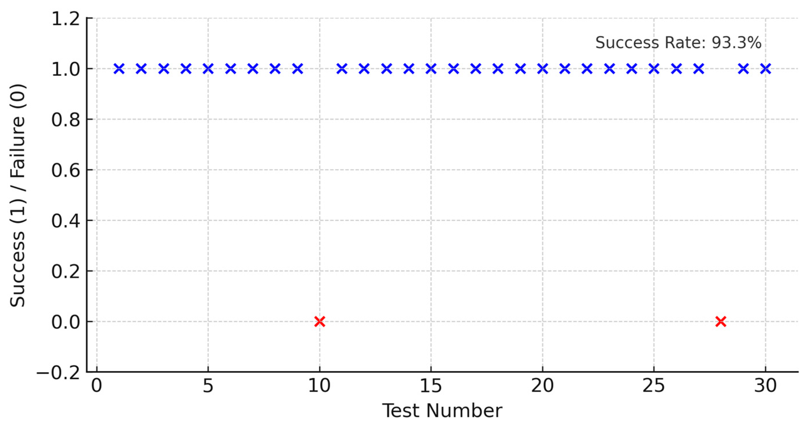 To validate the stability and repeatability of the proposed quick-change control system, repeatability experiments were conducted on both locking time and communication success rate. The experimental platform comprised a UR3 collaborative robot arm, a quick-change device, a tool end, and a ROS-based host computer control program. All experiments were performed under identical environmental conditions.
