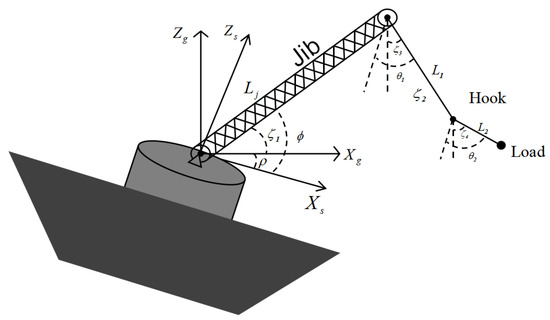 The problem of the control of land-fixed cranes has been studied extensively over the past few decades, such as optimal control [2,3,4,5], sliding mode control [6,7], adaptive control [8,9,10,11,12,13], and intelligent control [14,15,16,17,18,19,20,21]. The currently available methods include open-loop control methods and closed-loop control methods, etc. Compared to the single-pendulum crane, the double-pendulum crane system has more motion dimensions and stronger coupling, making it more difficult to eliminate load sway. In the case of the double-pendulum effect, the traditional method applied to the single-pendulum crane system is unable to achieve a good control effect. For this reason, in recent decades, the control problem of ship-borne cranes has attracted more and more attention, and many promising research results have been presented.