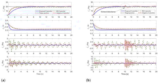 To assess the robustness of the proposed controller, we added external interference at s on the basis of the second group of simulation, and the simulation results are shown in Figure 3b. When the external interference is added at s, the PD control method and the non-linear controller cannot ensure that the swing angle of the hook and the load return to a small range. In contrast, the proposed controller shows good robustness.