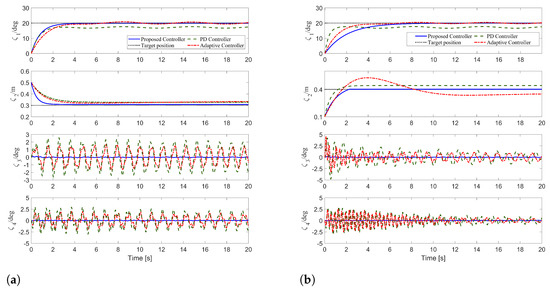 The results of Group 3 and Group 4. (a) The results of Group 3: increasing the load mass to 1 kg (blue solid line: the proposed controller; red dotted line: the adaptive controller; green dashed line: the PD controller). (b) The results of Group 4: changing the initial and target length of the rope to 0.1 m and 0.4 m, respectively (blue solid line: the proposed controller; red dotted line: the adaptive controller; green dashed line: the PD controller).