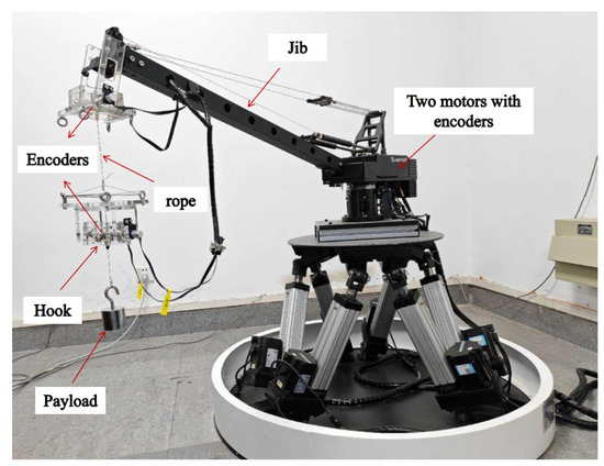 The experimental result is shown in Figure 6. It can be seen that the proposed controller can drive the jib and the rope to reach the target position quickly and accurately, and, at the same time, the swing angle of the hook and the load can be suppressed within a small range, in which the peak swing angle of the hook is 1.35 deg, and the residual swing angle is within 0.2 deg. The swing angle of the load is within 0.05 deg. This shows that the controller has a good control effect.