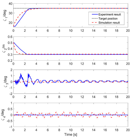 To verify the actual control performance of the proposed active disturbance rejection controller, experiments are carried out on the hardware experimental platform of a self-made double-swing crane, and the simulation results are compared. As shown in Figure 5, the device consists of a personal computer, motion control board, encoders, motors, jib, rope, hook, and payload. Two motors are equipped to actuate jib moving and suspension rope variation, respectively. Four encoders are used to measure the jib displacements, suspension rope lengths, and swing angles of the hook and payload, respectively. The physical parameters of the hardware platform are as follows: . The initial and target positions are set as , (the parameters are derived from actual measurements of the experimental platform).