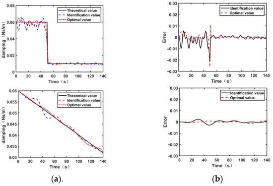 The RMSE and convergence times were used to evaluate the identification efficiency and accuracy of the multiscale parameter identification method [27] and quantum genetic optimization identification method. The accuracy and efficiency of the parameter identification process were selected as an objective function. The optimal scale factor was set to , based on the multiscale parameter identification result, and , based on the quantum genetic optimization result. The identification results are presented in Figure 4a, where it can be seen that the identification result was more consistent with the theoretical value after parameter optimization. After identification, the full-time-domain RMSE was 0.0037, demonstrating a reduction of 16.49%. The convergence time was 2 s, which indicated a decrease of 42.17%. Under the sudden change in the damping coefficient, the identification method could realize fast-tracking. The tracking time was reduced by 26.24%, and the full-time-domain RMSE was 0.0017.
