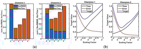 Figure 5a shows the stacked histogram of the normalized RMSE over time, and Figure 5b shows the QGA objective function curve with the design variables; blue and red colors indicate accuracy and time, respectively. A quantitative evaluation of time and accuracy is represented by the superposition. According to the multiscale identification method’s results, the interval between the scale factors was large in the stacked histogram. The scale factor curve obtained by the QGA was continuous. The method of QGA could provide better accuracy, efficiency, and scale factor value after weighting.