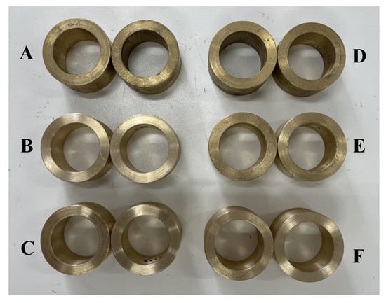The CB-DC model was fixed at its left end and rested on two support sleeves. The effect of different clearances on dynamic characteristics was studied using six groups of contact rings. A = 0.05 mm, B = 0.1 mm, C = 0.5 mm, D = 1 mm, E = 1.5 mm, F = 2 mm, as illustrated in Figure 6.