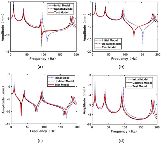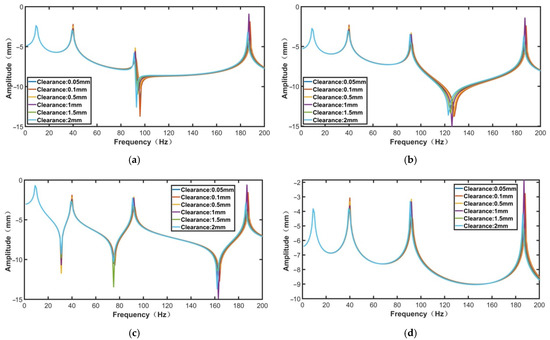 Using different clearance values of 0.05 mm, 0.1 mm, 0.5 mm, 1 mm, 1.5 mm, and 2 mm, the FRF comparison between the test and simulated model was performed, as shown in Figure 8. Figure 8a–d show the FRF results for clearance 1, clearance 2, the front, and the end at the clearance value of 0.5 mm, respectively; the blue, black, and red represent the results of the initial model with constant damping, the updated model with time-varying damping, and the test model, respectively. For the first and second orders, the FRF results obtained under constant damping agreed well with the results of the test model. However, there were certain errors for the third and fourth orders. These errors were mainly due to nonlinear factors such as clearance lubrication that affected the precision of dynamic parameters. Considering nonlinear factors, the FRF results obtained under time-varying damping had a smaller error in the first three orders, but there were certain errors for the fourth order because of the parameter identification errors. Overall, the error was within acceptable limits.