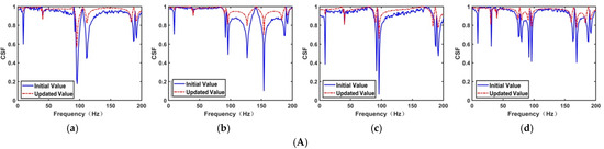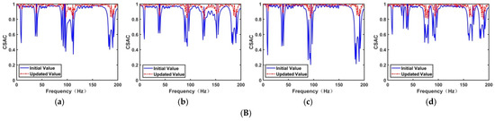 To further compare the differences in natural frequency, the model correlation analysis was performed by the relative error (RE) and modal assurance criterion (MAC), as shown in Table 2 The error of the initial model with constant damping was less than 7.7%, while the error of the updated model based on time-varying damping was less than 1.4%; thus, the maximum error was reduced by 6.3%. The MAC of the updated model was over 85%, which was higher than that of the initial model. The mean MAC of the first four orders of the updated model increased by 14.84% compared to the initial model. The error comparison of other clearance values is provided as shown in Figure A1, Figure A2, Figure A3, Figure A4, Figure A5 and Figure A6 and Table A1, Table A2, Table A3, Table A4, Table A5 and Table A6 in Appendix A.
