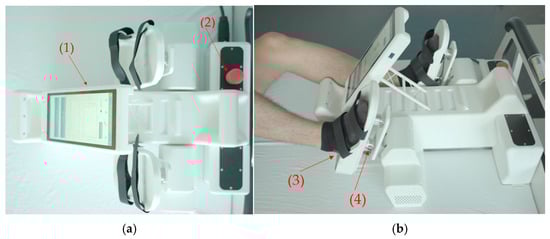 The prototype of the lower-limb therapy device on a medical bed (a) and with a test person (b): (1) touch screen, (2) emergency stop, (3) foot plate, and (4) force sensor.