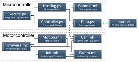 The programme was divided into two main components (Figure 4). Its architecture was designed to ensure that communication was initiated and controlled by the main programme through queries and the continuous transmission of commands. The scripts Firmware.mc, Motion.mh, Can.mh, Init.mh, and Param.mh operated on the standalone MiniMACS controller. This configuration facilitated the automatic start function and initialised the PID control parameters for both position and force controllers. In contrast, the scripts “Execute”, “Hosting”, “Controller”, and “Data” were executed on Raspberry Pi. CAN communication (red dotted line in Figure 4) between the Raspberry Pi and the MiniMACS was facilitated by both the Can.mh script on the MiniMACS and the “Controller” script on Raspberry Pi. The “Hosting” script utilised the “nicegui” library, employing its tools and building blocks to provide a comprehensive user interface (Figure 5) and establish connections to the implemented exergames (see Section 2.4). All data and overarching variables were securely stored within the “Data” script.