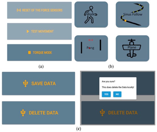 Regarding the user interface, three pages were created: Testing (Figure 5a), Computer Game (Figure 5b), and Data (Figure 5c). On the Testing page, tabs were created for the calibration of force and encoder sensors, initial movement testing, and motor mode selection. On the Computer Game page, several games could be selected. On the Data page, there were graphs to monitor the data and buttons to save or delete training data (Figure 5c). The user interface allowed the user to start/stop the system, set target force position profiles, and view the training results. The results, such as the target/actual force and position of the foot plates and the motor torque, were saved using the “Data” package.