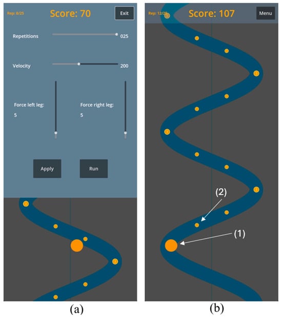 To encourage users to actively participate in training, computer games (Figure 5b) were incorporated into the training programme. The exercise games were developed through the employment of the Godot Engine (Godot 4, Godot). It synchronised the leg movement with the animation of the games. The movement path was predefined in the computer game engine. The moving object could be controlled by pressing the right or left foot plates with a certain displacement. The linear position difference between both feet was sent to the computer games to define the position of the moving point.