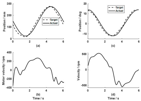 The passive mode was tested with the target positions for both legs as the sinusoidal trajectories (Figure 7). The PID controller parameters for the linear motors were kP = 40, kI = 0.25, and kD = 400. Regarding the motors for ankle rotation, the PID parameters were kP = 15, kI = 0.25, and kD = 25. The position control accuracies from a representative participant (P5) were 10.87 mm for linear movement (Figure 7a,b) and 1.28° for the ankle joint (Figure 7c,d). P5 was selected because its results were close to the overall mean results (Table 2).