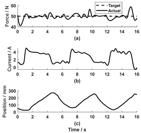 Force control of the active load on the right leg of the representative participant (P5). (a–c) are the force, motor current and the linear movement during the active training.