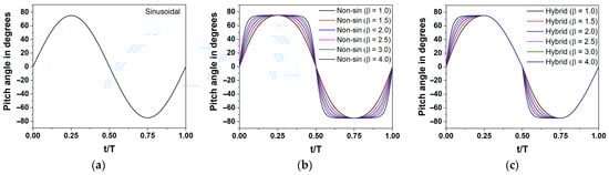Figure 3 illustrates the change in the instantaneous pitch angles. Non-sinusoidal and hybrid trajectories are dependent on the parameter β. A value of β = 1.5 was chosen as it yielded the best performance [49].