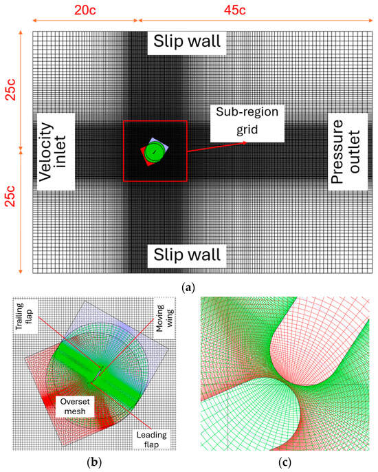 where − is the Reynolds stress. The dynamic mesh method is employed. A pressure–velocity coupling algorithm is employed. User-defined functions were used to specify the motion of the plates. Figure 4 depicts the numerical grid with a length of 70c and a width of 50c. The boundary condition is shown on Figure 4a. Figure 4b depicts the moving plates. Figure 4c depicts the gap between two flaps.