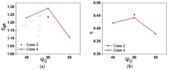 The calculated results for (a) total power coefficient and (b) efficiency for Cases 2 and 4.