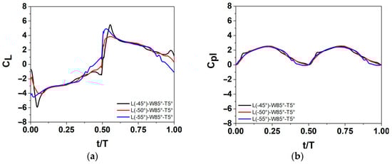 Figure 9 presents the pressure distribution over time for Case 4 at three leading pitch angles of 45°, 50°, and 55°. The power generation is primarily attributed to the pressure difference on the oscillating flat plate, which is influenced by the varying shapes of the flat plate during oscillation. At t/T = 0.05, as shown in Figure 9a, the pressure difference between the upper and lower surfaces is notably higher for 45° after the hinge position, primarily due to the vorticity’s position as shown in Figure 8. This pressure difference increases the pushing force, as shown in Figure 7a. At t/T = 0.25, the strong vorticity observed on the lower surface results in a weaker pressure distribution for the leading pitch angle of 55°. As shown in Figure 10b, the projected length in the x-direction increases as the pitch angle becomes larger.