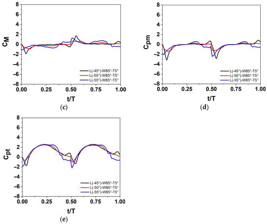 Comparison of (a) pushing force coefficient, (t); (b) pushing power coefficient, ; (c) moment coefficient, ; (d) moment power coefficient, ; (e) total power coefficient, .