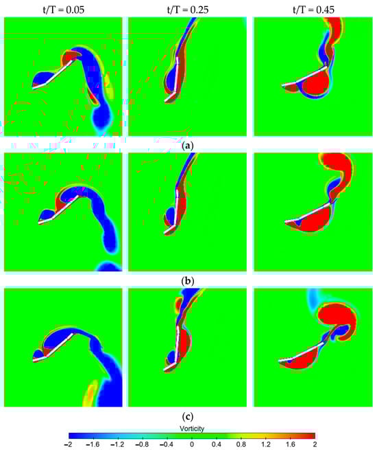 Figure 8 shows the vorticity contour associated with Case 4, where is 45°, 50°, and 55°, across time steps of 0.05, 0.25, and 0.45. At t/T = 0.05, the vorticity moves downstream; however, for a higher leading pitch angle of 55°, the movement is slower compared to the case with a smaller leading pitch angle of 45°. At t = 0.25T, the vorticity on the bottom surface is stronger for the 55° pitch angle compared to the 45° and 50° cases.