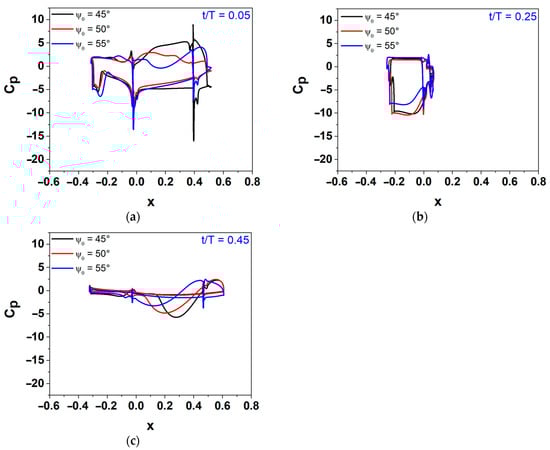 At t/T = 0.45, the pressure generates a penetrating flow through the gap between the leading flap and the wing body. The strength of this flow is influenced by the oscillating body shape and the leading flap pitch angles of 45°, 50°, and 55°. While the upper surface pressure distributions remain nearly identical, as shown in Figure 9c, the lower surface pressure distribution exhibits noticeable variations depending on the leading flap pitch angles. The vorticity core on the lower surface shifts from downstream at a leading flap pitch angle of 45° to upstream at a pitch angle of 55°. Correspondingly, the peak lower pressure also moves in the same manner, as shown in Figure 9c.