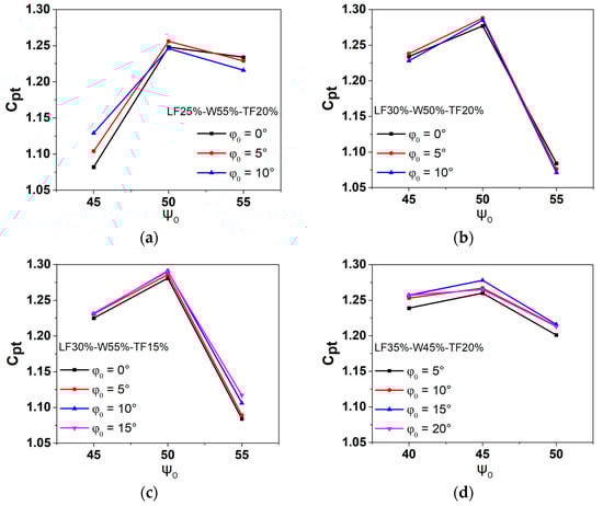 Average total power coefficient () for a wing with two flaps using a hybrid pitching motion: (a) LF25%, W55%, TF20%; (b) LF30%, W50%, TF20%; (c) LF30%, W55%, TF15%; and (d) LF35%, W45%, TF20% for Case 4 at wing pitch angle = 85° and various flap pitch angles.