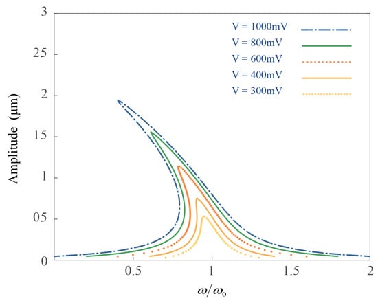 The frequency–amplitude pairs are measured at five values of electrostatic force, ranging from 300 to 1000 mV, and then frequency-to-amplitude response curves are constructed. As seen in Figure 1, the amplitude–frequency characteristic of the resonator vibration significantly changes with variations in amplitude and frequency mismatch. With increasing excitation force, the vibration amplitude gradually rises.