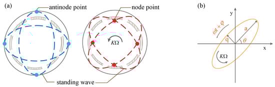 The standing wave of the two-degree-freedom resonant gyroscope is in the form of a four-wave belly and generates a reverse procession under the external excitation. The shape of the standing wave can be decomposed into two ellipses along two orthogonal axes, where the four endpoints of the long axes of the two ellipses are called the antinode points and the intersection of the two ellipses is called the node point. The concept of RIRG is shown in Figure 2.