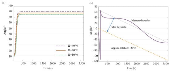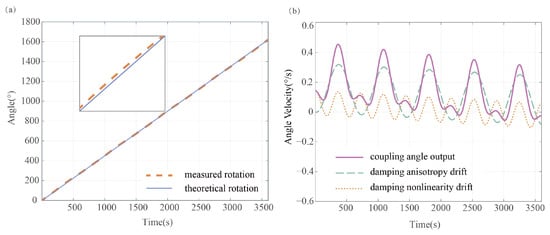 (a) Comparison of the theoretical angular measurement value and the actual angular measurement with drifts fluctuating around the theoretical output. (b) There are harmonic forms of the angular measurement drift errors in the angular velocity.