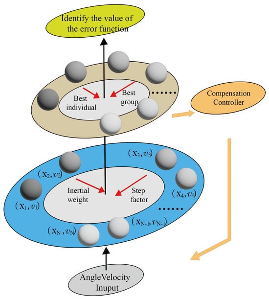 The harmonic parameters are evaluated using the IPSO, and the optimal solution is obtained. Each particle represents a different set of vector u and these particles are conceptual entities that travel through the multidimensional search space. At any iteration, each particle has a position and a velocity. The identification error function is designed to evaluate the compensation model performance. The identification error function is also the objective function of the particle swarm update, which ultimately reflects the accuracy of the identification. Then, the intelligent controller compares the gyroscope output with the fitting angular output by identification and updates the parameter vector by using the IPSO method. The individuals with the smallest fitness function are found by following the current search best value. When the minimum of the function is reached, the RIRG output is decomposed optimally.