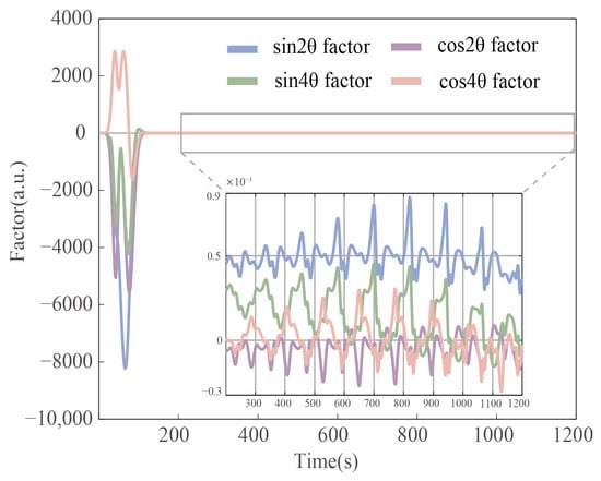 Equation (13) indicates that the angular output of the resonant gyroscope contains a linear accumulation drift and a period drift, both of which are determined by the combined effects of the damping anisotropy and the damping nonlinearity components.