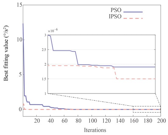 The core of the IPSO algorithm is to find a particle’s position that can satisfy the population’s optimal solution, and the investigation index is the objective function value as small as possible. The range of particle motion velocity is set within and the range of u is set within , the population particle number is set as 150 and the number of iterations is set as 200. And then, the PSO and IPSO parameter initialization are set, respectively, to generate the random population. As shown in Figure 8, the individuals with the smallest fitness function are found through iterations in the population. When the number of iterations reaches 160, the IPSO algorithm has converged, while the PSO has not yet fully converged.