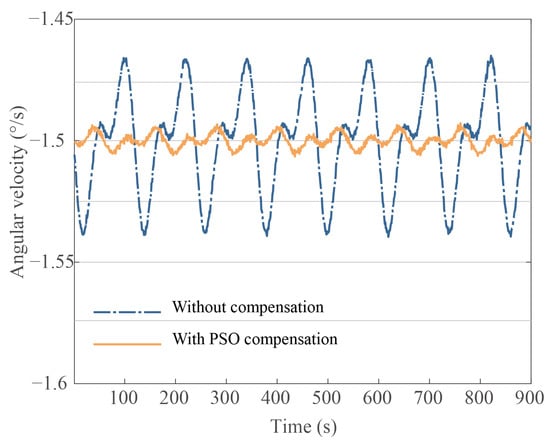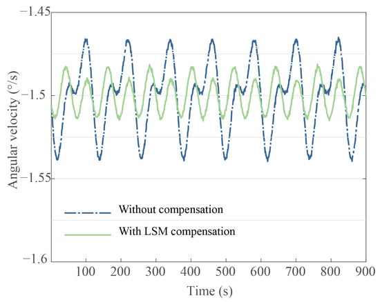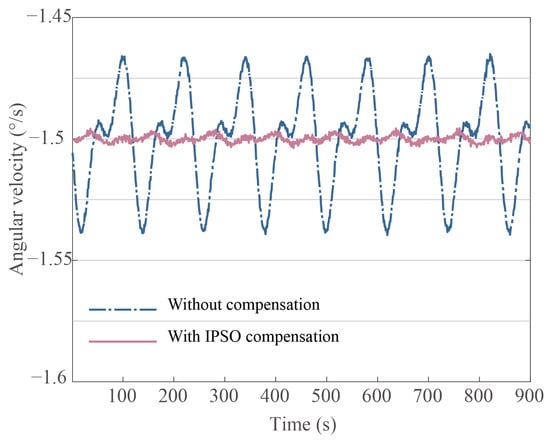 When the gyroscope is under constant rate input, the fluctuation magnitude of the standing wave rotation rate indicates the maximum angle drift. Figure 9, Figure 10 and Figure 11 show the compensation results after minimizing the harmonic errors under diverse parameter identification methods and demonstrates the effectiveness of the IPSO as a powerful tool in the process of reducing bias drift error caused by damping anisotropy and damping nonlinearity. In Figure 9, Figure 10 and Figure 11, the input rate condition is kept consistent. Following the IPSO-based compensation, the bias drift decreased from 2.1046 × °/s to 1.4722 × °/s. In comparison, other identification methods, including the traditional PSO and LSM, bias drift compensated values of 2.4533 × °/s and 9.8372 × °/s, respectively.