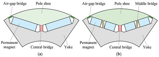Interior rotor topology structures. (a) V-shaped interior rotor. (b) Multi-bridge V-shaped interior rotor.