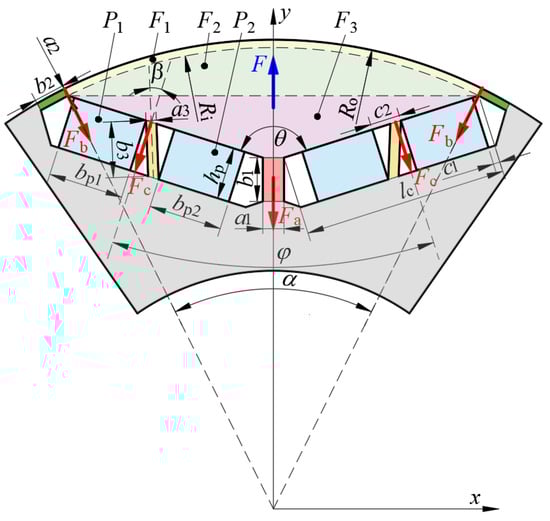 where AFn is the cross-sectional area of the nth region Fn. Due to the complex shape of the pole shoe region, it is divided into an annular region F1, an arc-shaped region F2, and a trapezoidal region F3, as shown in Figure 2. Based on this division, the centroid position of the pole shoe region can be expressed as follows: