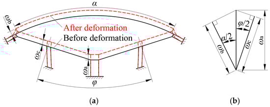 where φ = π − θ. Under the action of forces, the magnetic bridges will undergo elastic deformation, as depicted in Figure 3. According to the theory of material mechanics, the deformation of the three magnetic bridges must be coordinated with each other, that is, to meet the geometric compatibility condition. Therefore, from the geometric relationship of each magnetic bridge before and after deformation in Figure 3, it can be seen that the deformations of the central magnetic bridge ωa, the air gap magnetic bridge ωb, and the middle bridge ωc satisfies the following: