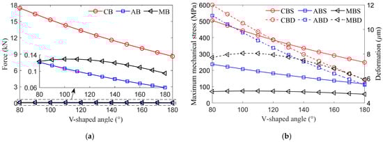 The V-shaped angle and pole shoe angle are critical parameters in the design of V-type interior rotor structures, significantly influencing the forces, MMS, and deformations of the magnetic bridges, as illustrated in Figure 4 and Figure 5. In these Figures, CB, AB, and MB represent the central bridge, air gap bridge, and middle bridge, respectively, while S and D denote stress and deformation. The meanings of the legends in the following Figures are the same as here.