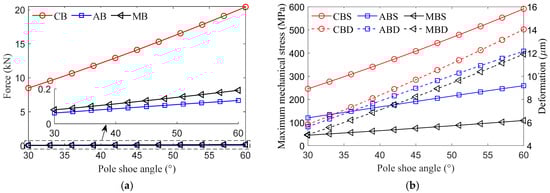 Influence of the pole shoe angle. (a) Forces acting on the magnetic bridges. (b) MMS and deformation of the magnetic bridges.