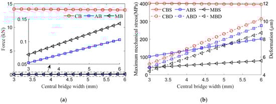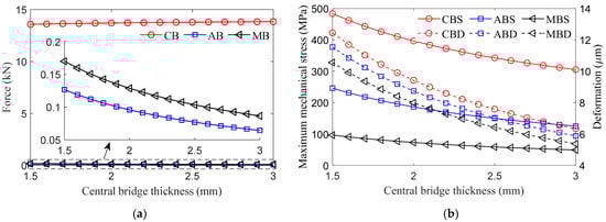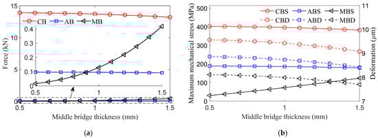 The influence of the central bridge structural parameters on the force, MMS, and deformation of each magnetic bridge is shown in Figure 6 and Figure 7. As the thickness of the central bridge increases, the total centrifugal force remains unchanged, and the cross-sectional area of the central bridge increases. According to Equations (22)–(24), the force on the central bridge increases slightly, while the forces on the air-gap and middle bridges decrease, as shown in Figure 6a. Although the force of the central bridge increases, its increment ratio is obviously smaller than the increment ratio of the cross-sectional area, so the MMS and deformation of the central bridge decrease. Consistent with the force trend, the MMS and deformation of the air-gap middle bridges decrease synchronously.