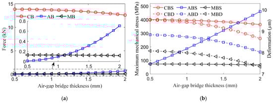 Influence of the air-gap bridge thickness. (a) Forces acting on the magnetic bridges. (b) MMS and deformation of the magnetic bridges.