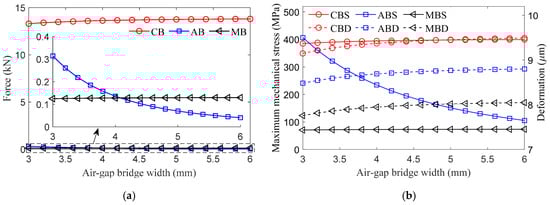 Influence of the air-gap bridge width. (a) Forces acting on the magnetic bridges. (b) MMS and deformation of the magnetic bridges.