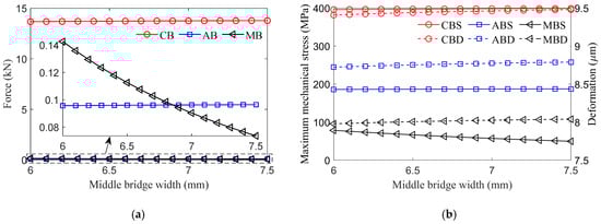 Conversely, as the central bridge width increases, its force gradually decreases, while the forces on the air-gap and middle bridges increase, as shown in Figure 7a. The MMS of the central bridge follows the same trend in the force, indicating that width has a minimal impact on its MMS. However, due to the increase in width being much larger than the decrease in force, the central bridge deformation increases significantly, as shown in Figure 7b. Similarly, the MMS and deformation of the air-gap and middle bridges increase in line with the force changes.