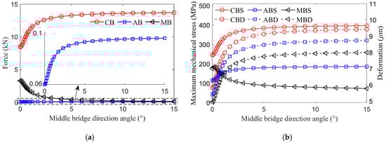 Influence of the middle bridge direction angle. (a) Forces acting on the magnetic bridges. (b) MMS and deformation of the magnetic bridges.