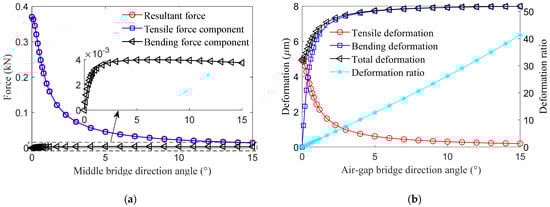 When the direction angle is zero, the force direction of the middle bridge aligns with its width, resulting in the middle bridge only bearing tensile loads, as shown in Figure 13a. Bearing only tensile loads in the middle bridge not only significantly reduces the force on the central bridge but is also highly beneficial for reducing rotor deformation. Under the same load, for magnetic bridges subjected only to bending or tensile deformation, the bending deformation is much greater than the tensile deformation. For the middle bridge subjected to both tensile and bending loads, the variations in tensile and bending deformation with the direction angle are shown in Figure 13b, where the deformation ratio is defined as the ratio of the bending deformation to the tensile deformation at the same orientation angle. It can be observed that as the direction angle decreases, the tensile deformation increases, the bending deformation decreases, and the deformation ratio decreases nearly linearly. When the direction angle is reduced to zero, the total deformation of the middle bridge reaches its minimum, while the force on it reaches its maximum, representing the optimal design value for the direction angle.