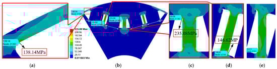 Stress distribution of the multi-bridge V-shaped rotor. (a) Enlargement of the air-gap bridge in Scheme 3. (b) Overall perspective in Scheme 3. (c) Enlargement of the central bridge in Scheme 3. (d) Enlargement of the middle bridge in Scheme 3. (e) Enlargement of the middle bridge in Scheme 2.