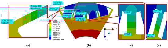 Deformation distribution of the rotor in Scheme 3 in z direction. (a) Enlargement of the air-gap bridge. (b) Overall perspective. (c) Enlargement of the central bridge. (d) Enlargement of the middle bridge.
