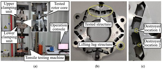 By skillfully using the tensile testing machine and designing an appropriate tooling, a rotor strength testing device can be built, as shown in Figure 18a. The basic process of the strength test is as follows: Firstly, the total centrifugal force generated by the rotor pole shoe and permanent magnet at a given speed is calculated according to Equation (13). This force is then converted into an equivalent tensile force, which is gradually increased from zero to the predetermined value, held constant for approximately 20 s, and subsequently unloaded back to zero. This tensile force serves as the input signal for the test device. Then, the measured rotor core is fixed by the upper and lower clamping devices of the tensile testing machine and tooling to ensure that the loading-force direction is along the width direction of the central bridge. The lug structure in Figure 18b is designed for this purpose. Subsequently, the loading command is issued by the console to test the rotor core and record the test data. Finally, the test results are analyzed according to the theory of material mechanics. The primary objective of the experiment is to replicate the equivalent centrifugal force conditions and validate the mechanical response of the magnetic bridges under these conditions, consistent with the analytical and numerical results. It should be noted that the lifting lug shown in Figure 18b is an auxiliary structure specifically designed to facilitate the application of tensile loads in the static experiment. Under static conditions, the lifting lug does not generate any additional forces, and its presence does not affect the accuracy of the load applied to the magnetic bridges.
