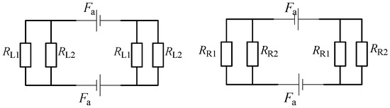 As shown in Figure 1 and Figure 2, the displacement of the mover is defined as , with the right side indicating the positive direction, and the central axis of the midpoint between the two outer stators is defined as the initial position (the equilibrium position). The distance between the two outer stators is denoted as , the axial length of a single outer stator is represented by , , and . In the radial magnetic circuit structure illustrated in Figure 2b, Figure 3 and Figure 4 present the magnetic circuit models for the separately acting excitation and armature magnetic fields on the left and right sides, respectively. In Figure 3, and denote the magnetic reluctances of the left and right inner air gaps, respectively. and signify the leakage magnetic reluctances between the permanent magnet poles for the left and right sides, respectively, while represents the magnetic motive force of the permanent magnets. In Figure 4, indicates the magnetic motive force of the armature magnetic field, represents the air gap magnetic reluctance associated with the length of the left stator, represents the air gap magnetic reluctance associated with the length of the left stator, denotes the air gap magnetic reluctance associated with the length of the right stator, and denotes the air gap magnetic reluctance associated with the length of the right stator. The complex distribution of leakage magnetic flux resulting from the magnet extending beyond the outer stator’s sides poses significant challenges for accurate representation in simplified magnetic circuit models. Consequently, it is assumed in these models that the motion range of the magnet remains within the lateral boundaries of the outer stator, with leakage flux at the edges being disregarded.